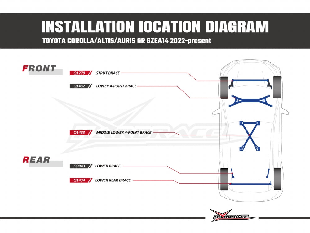 HARDRACE is proud to announce the new front lower 4-point brace for GR Corolla. This brace will reduce vehicle chassis flex and deflection to increase the rigidity of your car under high speed driving and hard cornering, resulting in better and quicker handling response.