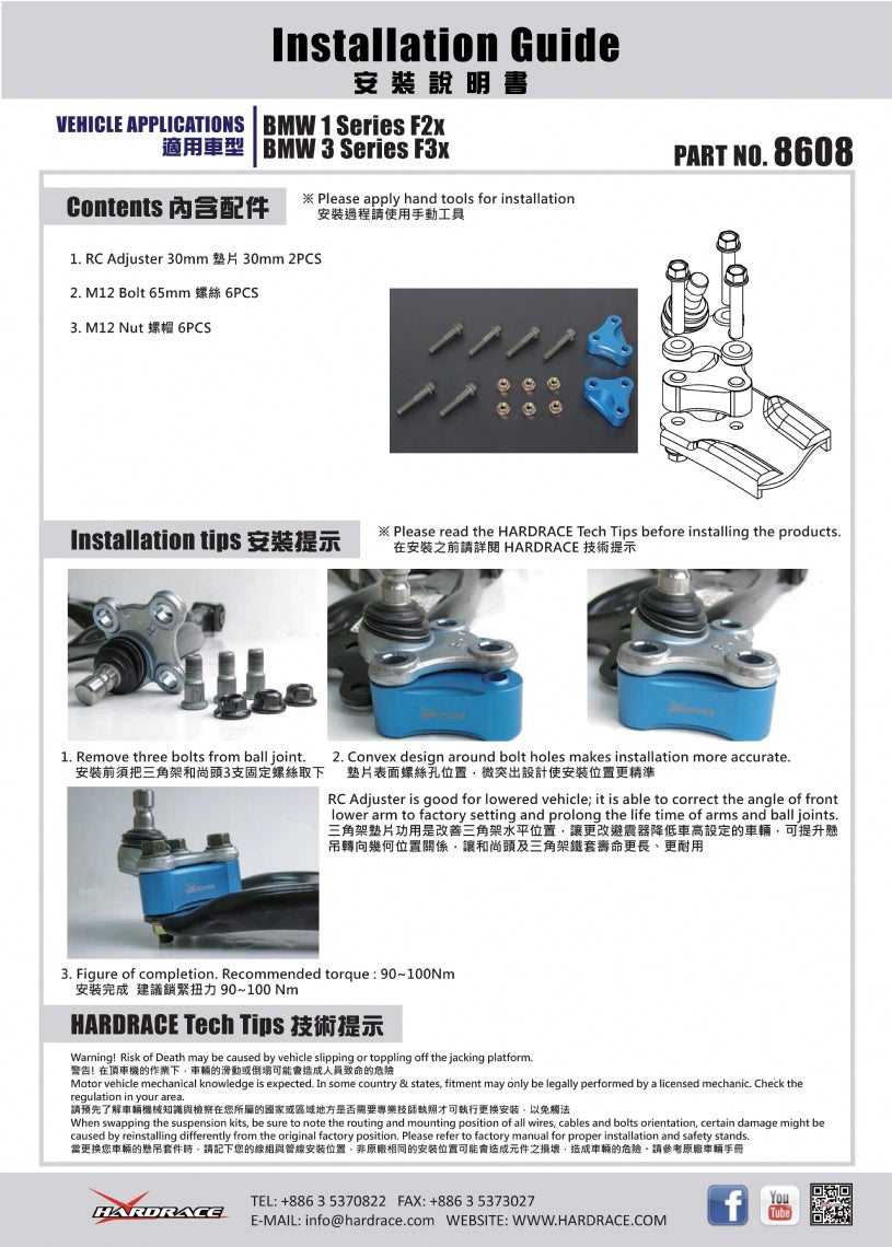 Hardrace geometry correction spacers will fix control arm geometry of lowered cars, putting the control arms back to stock position to restore handling performance, meanwhile keeping the bushings from constant twists and maintaining proper ball joint operating angle for better lifespan. The spacers are made from high strength CNC machined aluminum alloy with anodized surface to offer highest durability, sustain heavy loads and yet remain light-weight.