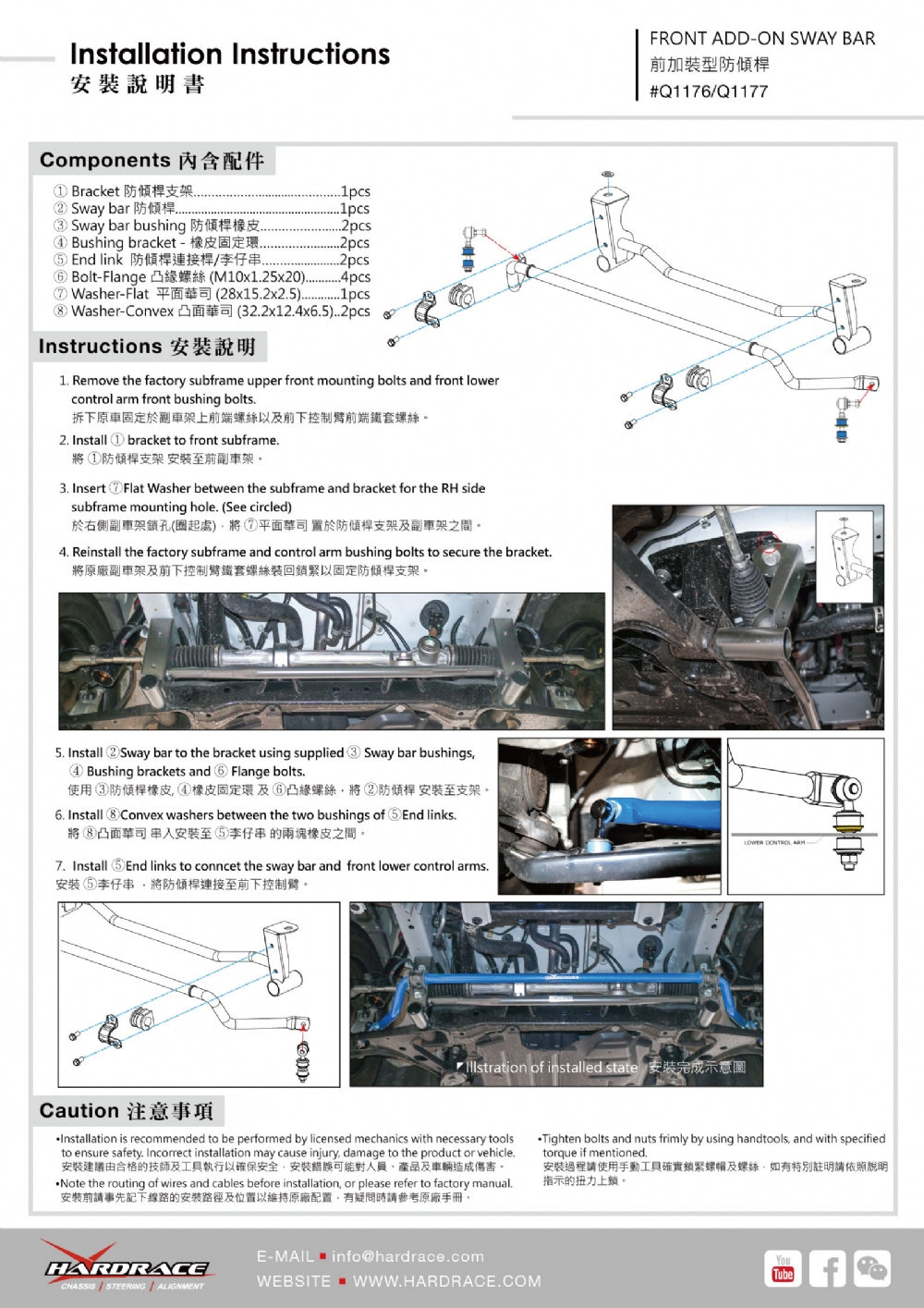 The add-on sway bar is designed exclusively for 2008+ TownAce, which does not come with sway bars from factory. The sway bar ties the suspension arms together across the front or rear end and keeps your car flat in turns instead of leaning over to one side, offering better stability and handling response especially at high speeds and cornerings. This kit features a sway bar mounting bracket that bolts into the existing mounting holes on the subframe, does not required any drilling or welding for installation. With the tubular center reinforcement bar design, the bracket also functions as a subframe brace to improve chassis rigidity, definetely the best choice to improve handling performace for your TownAce.